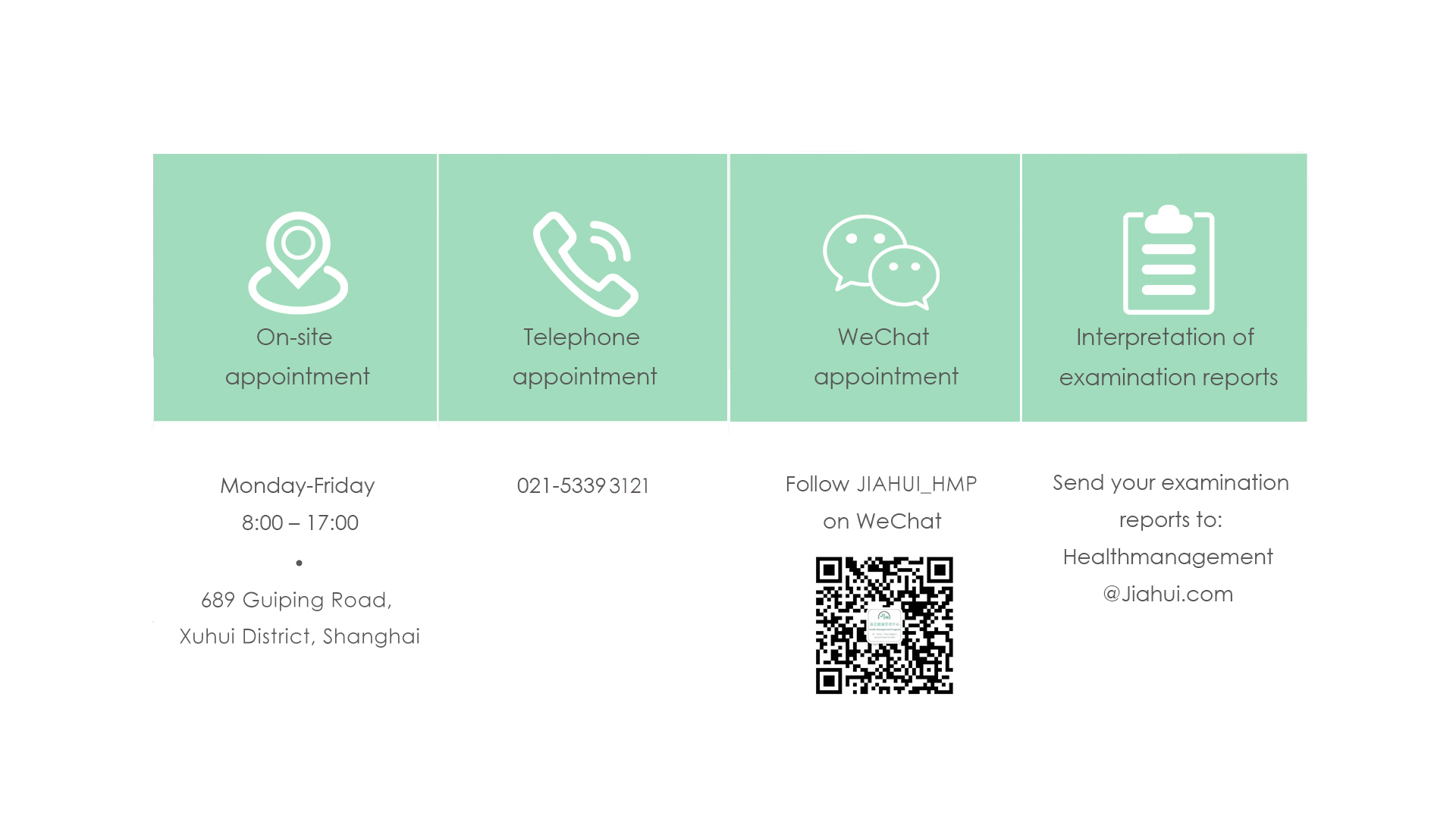 Based on our medical team, Jiahui Health Management Center has a strong lineup. We are dedicated to your whole health screening process with enthusiasm and professionalism. If any disease is found during your screening, we will refer you to appropriate doctors at Jiahui as soon as possible to receive further diagnosis and treatment. This also help you avoid repeated inspections which you may encounter when you go to other hospitals after receiving health screening at other independent centers.