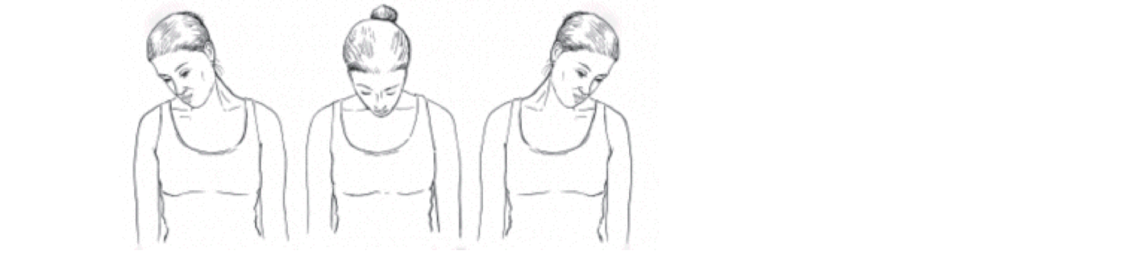 • 颈部倾斜:头部向右倾斜,试着将耳朵靠在肩膀上,使用指尖在太阳穴上轻施压力并保持数秒,然后还原。向左边重复同样的动作。重复两边的动作4次。