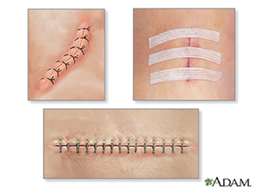 • 伤口闭合需要缝线,使用缝合皮钉,组织凝胶或免缝胶带。医生可能会使用局部麻醉药物以减轻您的疼痛,或者其它药物来避免您过度紧张。闭合的伤口有助于愈合和预防感染。缝合的伤口会减少疤痕的产生,但有些伤口在没有缝线的情况下愈合更快。