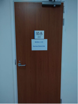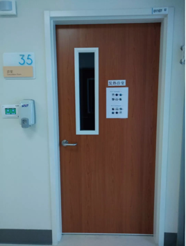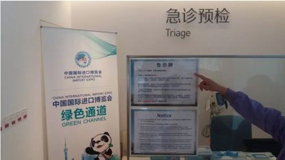 图为院内进博急诊预检专用通道,张贴传染性疾病患者告示,并可通过建院之初的整体性高标准设计,直接分流传染性和非传染性患者进入相应完全隔离的诊疗区域(两者从门诊诊室、住院病房、卫生设施、电梯到空气、污物运输都互为隔离)