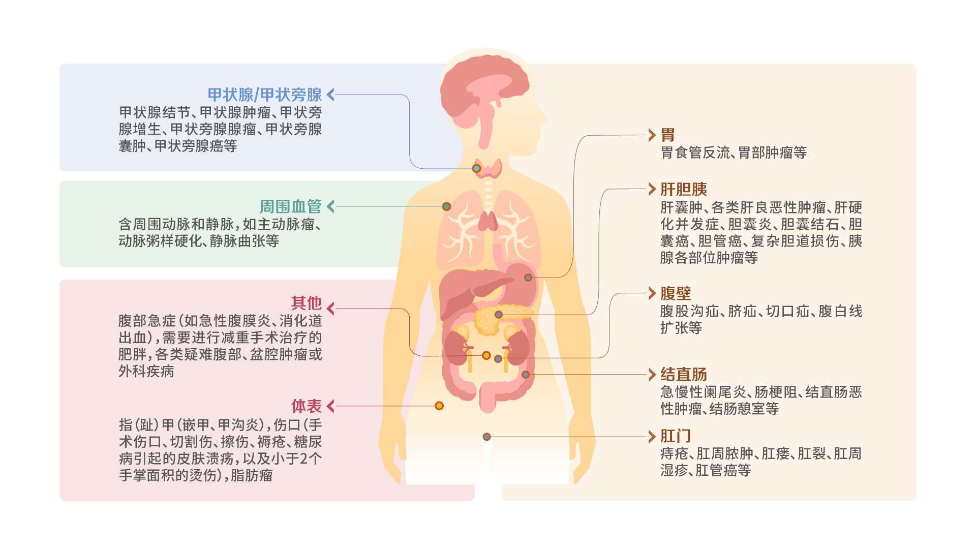 · 2D/3D高清腹腔内窥镜系统: 广泛用于各类微创腔镜手术,如腹腔镜下胆囊切除术、腹腔镜下阑尾切除术、腹腔镜下肝脏肿瘤切除术、腹腔镜下胰腺切除术、腹腔镜下胃切除术、腹腔镜下结直肠肿瘤根治术等