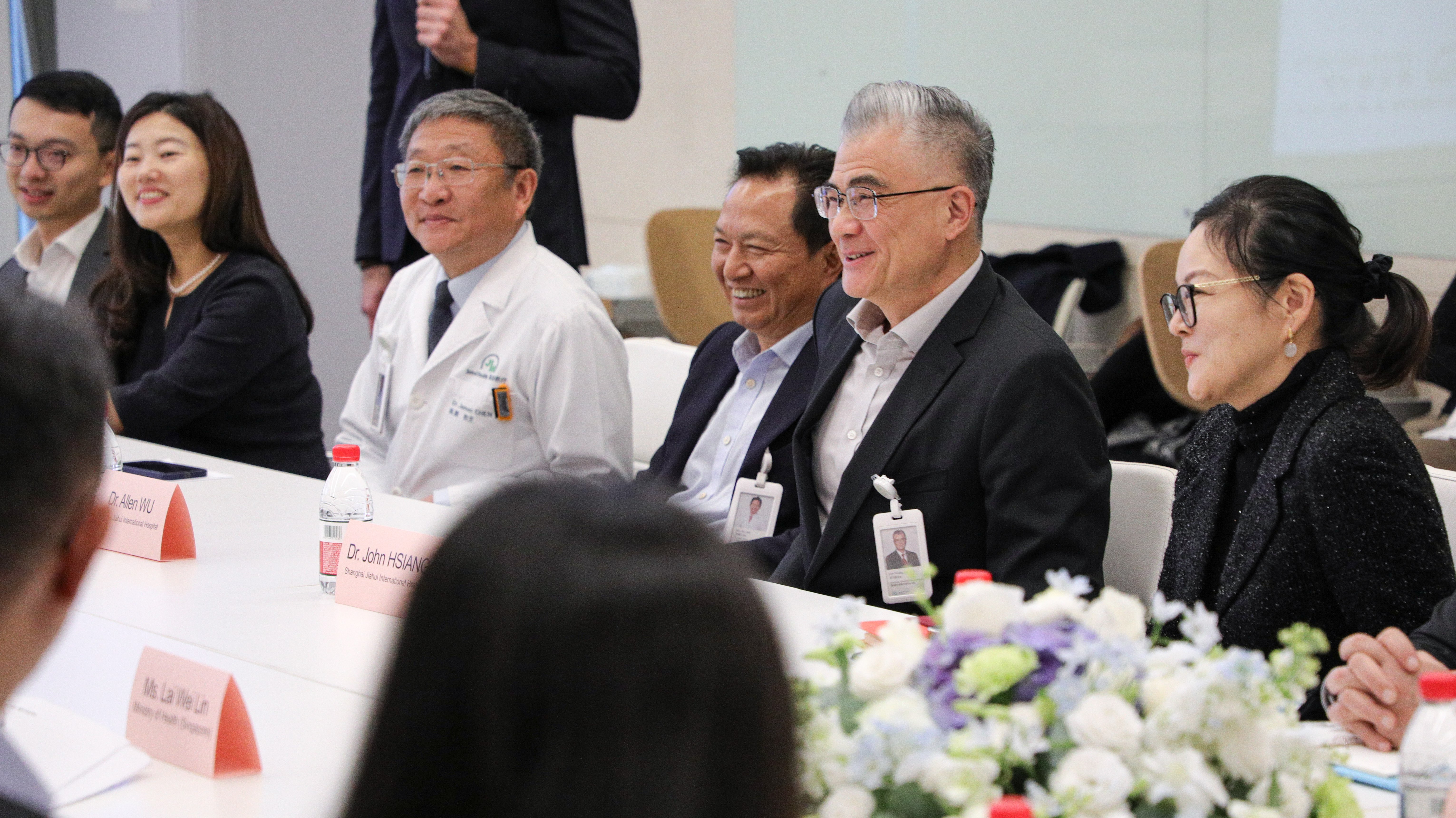 Jiahui Health leadership, including Dr. John Hsiang, Ms. Hongyan Guan, Dr. Allen Wu, and Dr. James Chen, during the exchange with the Singapore delegation.