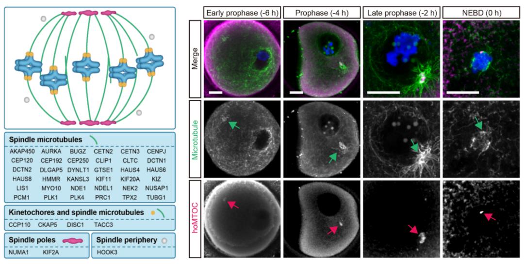 首先,研究人员利用免疫荧光和高分辨成像技术对核膜破裂后的人卵母细胞进行观察,结果显示其形成的纺锤体微管主要聚集于染色体的动粒(kinetochore)位置。进而,通过活细胞实时三维成像技术(3D time-lapse imaging)详细记录了动粒起始微管组装的动态过程。由此推测,人卵母细胞动粒可能存在特殊的微管组织中心起始纺锤体微管聚合。随后,研究者在处于第一次减数分裂中期的人卵母细胞中,对86个主要的中心体或微管相关蛋白进行了定位分析,最终确定43个蛋白具有人卵母细胞纺锤体相关定位。其中,有四个蛋白(CCP110,CKAP5,DISC1 和 TACC3)同时定位于动粒和微管,这与他们在有丝分裂过程中的定位截然不同。研究人员于是将上述四个蛋白在GV (Geminal vesical) 期人卵母细胞中进行定位观察,另人意外的是,在GV期核膜附近这四个蛋白组成了一种此前从未被发现的特殊结构,同时在该结构周围观察到新生微管聚集,而在鼠、猪卵母细胞中并未观察到该结构。由于该结构在人卵母细胞中负责聚合微管,因此研究者将其命名为人卵母细胞微管组织中心(human oocyte microtubule organizing center,huoMTOC)。